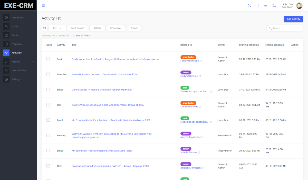 - With Calendar and basic list view all activities can be witnessed and filtered as per requirement.